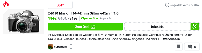 Just like in the USA also in Europe Olympus is offering a ton of deals ahead of their camera business sale. Today you get the rather excellent E-M10III with kit lens for 444 Euro only using the checkout code “brian444” at Olympus Deutschland.