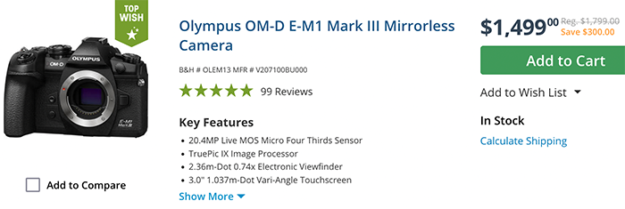 E-M1III at Amazon, Adorama, BHphoto, GetOlympus.