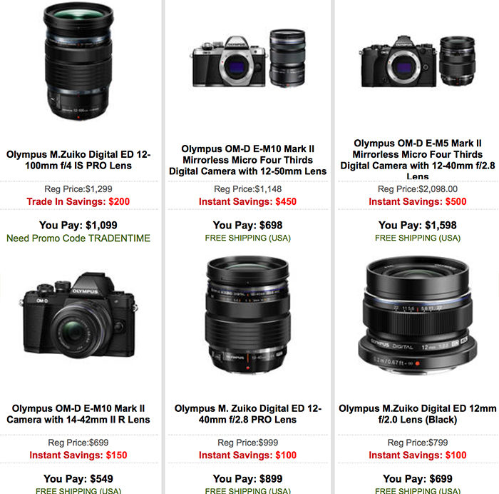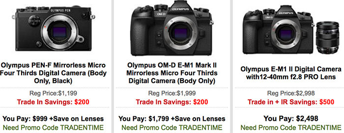 In USA you can now trade in any camera and/or lens and get up to an $800 Bonus on Olympus cameras and lenses. Detailed info can be found on those special pages at BHphoto (Click here) and Adorama (Click here).