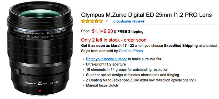 $50 off on the Olympus 25mm f/1.2 PRO lens at Amazon