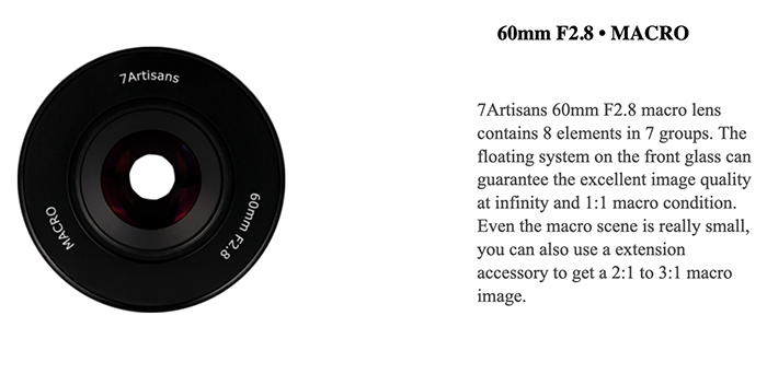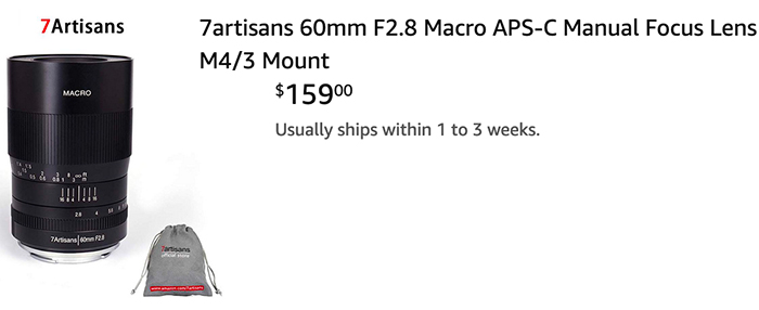 7Artisans lauched the new 60mm f/2.8 macro MFT lens June 5, 2019 news 0 Comments 7Artisans launched the new 60mm f/2.8 MFT macro lens on Amazon US, Amazon DE, Amazon UK, Amazon IT. Image samples can be seen on 7artisans. And here are soem more info: