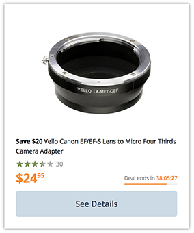 And you save $20 on the Vello Canon EF/EF-S Lens to Micro Four Thirds Camera Adapter sold by BHphoto (Click here).