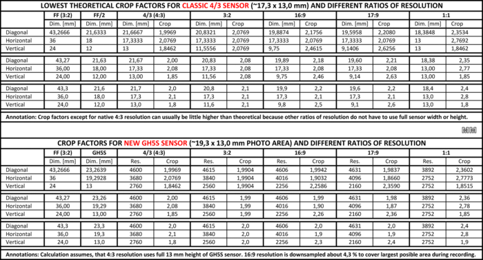 Corrected crop factors of GH5S calculating by Eno. 4:3 horizontal factor for 3860 pixels is 2,08, other horizontal crop factors are from 3:2 to 1:1 – 1,99/ 1,90/ 1,87/ 2,78. Crop 2 is for diagonal size.
