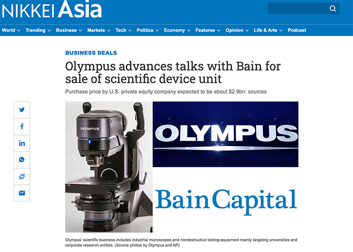 Nikkei reports that Olympus is in advanced talks with Bain for sale of scientific device unit. After the camera segment Olympus is selling another important business :(