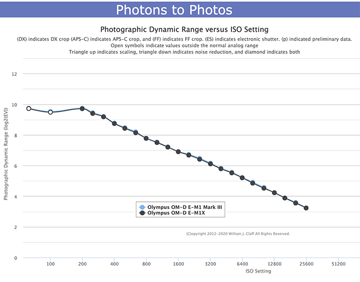 Photonstophotos plotted the Dynamic Range performance of the new E-m1III. As expected it’s the same as the E-M1X.