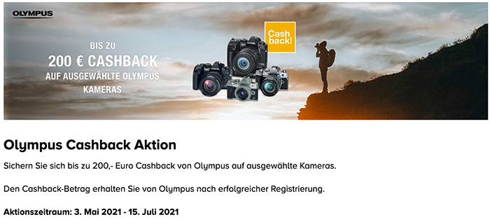 The list of Olympus cashbacks can be seen at FotoKoch Germany, Olympus Germany, Olympus France, Olympus Italy, Olympus Spain, Olympus UK, Olympus Netherland.