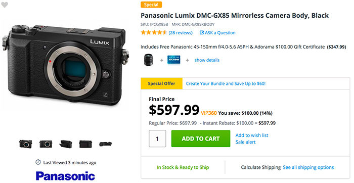 You get the GX85 with free 45-150mm lens and free $100 gift card at Adorama (Click here).