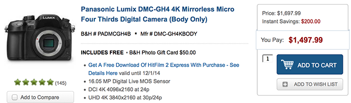 GH4 for $1,447 at BHphoto (with $50 gift card included).