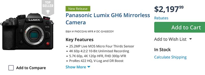 GH6 at BHphoto, Amazon, Adorama. In EU at Fotokoch DE, Calumet DE, Foto Erhardt DE. WexUK, Park UK.