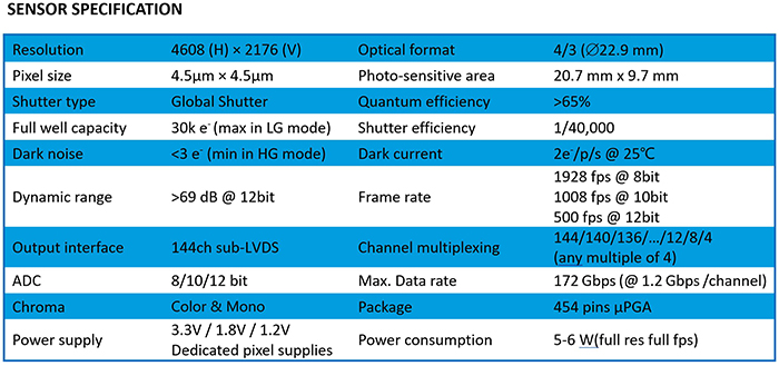 GSPRINT4510 is a 10 Megapixel (4608 x 2176) 4/3” (22.9mm) high speed image sensor designed with the latest 4.5 µm charge domain global shutter pixel. It achieves more than 30 ke- charge capacity and less than 3 e- rms read noise. Using an advanced 65 nm CIS process with light pipe technology, the sensor achieves >65% QE and more than 1/40,000 shutter efficiency. With on-chip charge binning, full well capacity can be further increased and frame rate is almost quadrupled.