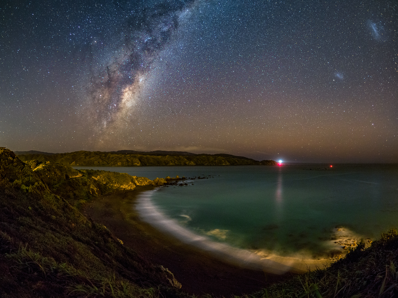 This is the result – a sweeping night view in which the waters of Breaker Bay show a wonderful jade-like hue while the star and dust fields of the Milky Way soar above…