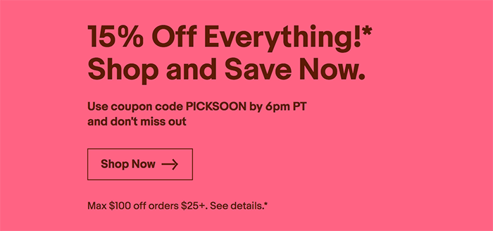 - This Coupon is a 15% discount off a minimum purchase of $25 valid from 8:00 AM PT on September 27, 2018 until 6:00 PM PT on September 27, 2018. The Coupon discount is capped at a maximum value of $100. Discount applies to the purchase price (excluding shipping, handling, and taxes) of eligible items on eBay.com, cafr.ebay.ca and ebay.ca. *Eligible items exclude warranties and protection plans, as well as items from the Coins & Paper Money, Gift Cards & Coupons, and Real Estate categories. Coupon must be used within a single transaction (and can include multiple eligible items), while supplies last. Max one redemption per user.