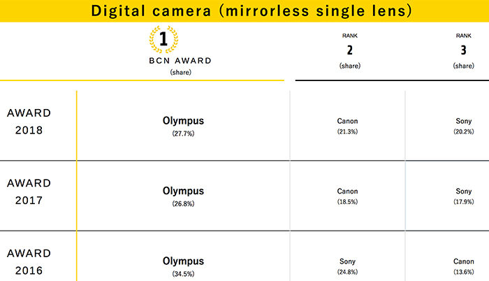BCN published the 2017 sales numbers. And once more Olympus is leader within the mirrorless camera market. They managed to increase the share by 0,9%. What’s again surprising me is the good performance of Canon despite their lack of lenses in their EOS-M range. I guess the “brand-value” is still strong enough to help them selling their EOS-M cameras.