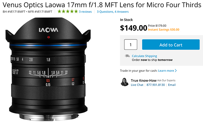 Save $30 on the Laowa 17mm f/1.8 MFT lens at BHphoto.