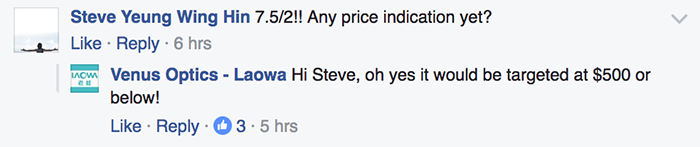 Venus Optics said the new Laowa 7,5mm f/2.0 MFT lens price is “targeted” at $500 or below.