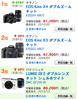 Mirrorless cameras are very popular in Japan. That’s why you can find the Panasonic GF2 under the three most sold system cameras (last week sales). Source: BCNranking.