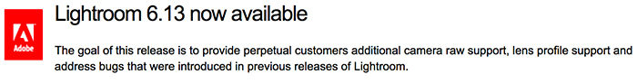 Lightroom 6.13 now available with E-M10III support October 27, 2017 news 0 Comments Lightroom 6.13 is now available with full E-M10III support. More info at Adobe Blog.