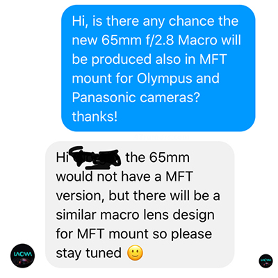 New Laowa Macro MFT lens coming.. April 2, 2020 Rumors 0 Comments Our reader “X” sent us the content of his chat with Venus Optics. They confirmed a MFT macro lens is coming soon.