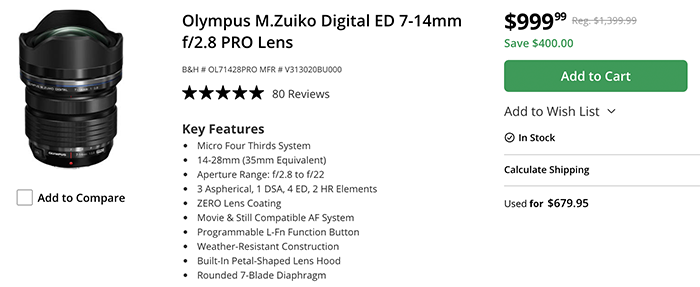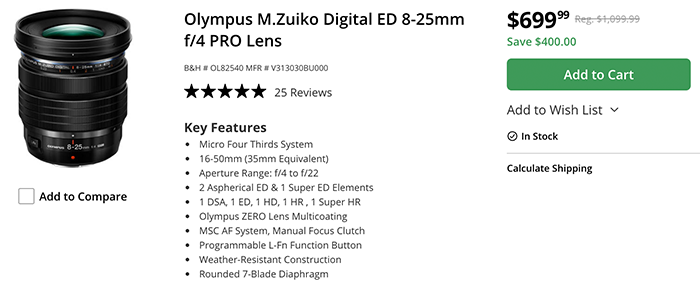 New low price on the Zuiko 8-25mm and 7-14mm lens (both $400 off) July 29, 2024 deals 0 Comments This is the new best price ever on the: Zuiko 8-25mm f/4.0 lens sold by Amazon and BHphoto (now $400 off and final price $699) Zuiko 7-14mm f/2.8 lens sold by Amazon and BHphoto (now $400 off and final price $999)
