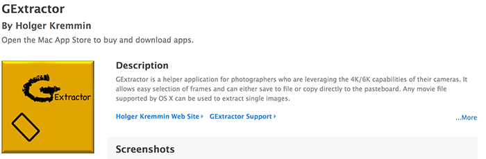 There is a new app for OS X available in App Store – GExtractor. From now one it is very easy to get the best frames out of a video file. It works with all formats supported by OSX. With High Sierra it is possible to extract from 6K movies out of the GH5. The quality of extracted images is better than all other solutions based on FFMPEG.GExtractor is a small OSX app to extract frames from video files. It supports all movie codecs which are supported by OSX. Basic features are extract single frames to file or pasteboard as well as batch extraction of selected files. To optimise the workflow most of the actions are performed by keyboard strikes. Supported output format are JPEG in highest quality, TIFF and PNG. Once OSX supports saving in HEIC/HEIF this function will be enabled.