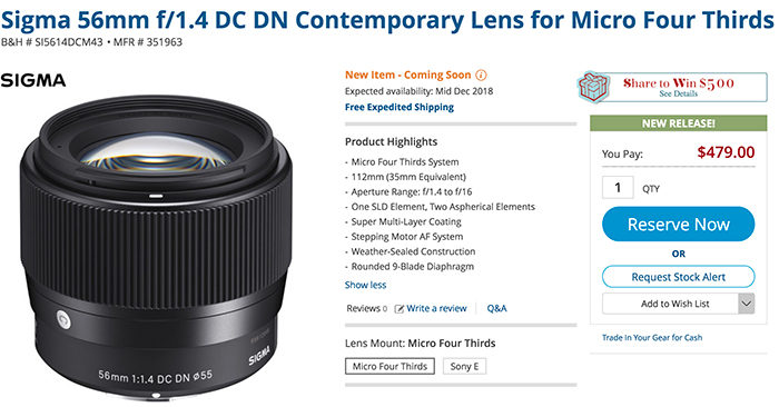The new Sigma 56mm f/1.4 MFT lens is now available for preorder at Adorama, FocusCamera and BHphoto.