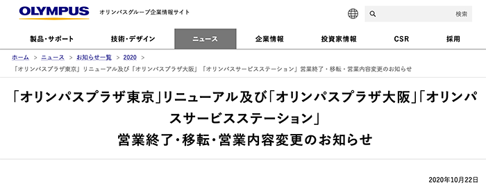 I have some bad news from Olympus in Japan. Olympus has plazas and service stations in four cities (Tokyo, Osaka, Fukuoka, Sapporo) in Japan. Half of them are being closed. Yesterday, Olympus announced that the plazas and service stations in Osaka and Sapporo will be completely closed in December. Also, the service station in Fukuoka will move to somewhere else. Also, the service center and plaza in Tokyo, which is using two floors in a building, will be reduced to a single floor. The announcement is on the page https://www.olympus.co.jp/news/2020/an01868.html