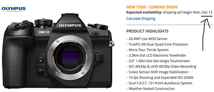 The E-M1II shipment will start 10 days later than previously reported. According to an updated BHphoto availability note the E-M1II will now start shipping out on December 12.