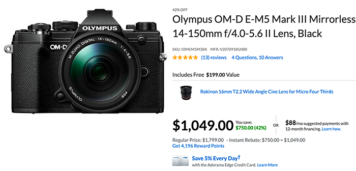 Olympus E-M5III with 14-150mm II Lens + Rokinon 16mm T2.2 Cine Lens $1049 + free s/h at Adorama