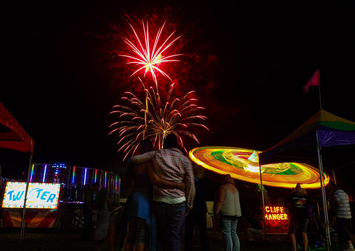 Shutter speed is set to four seconds, which helps capture the streaming trails of the fireworks.