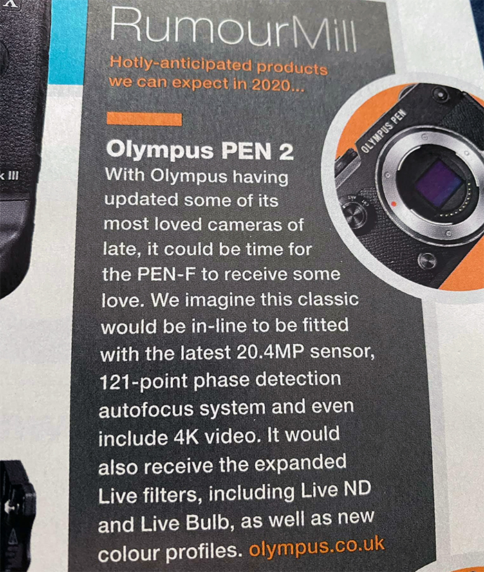 A UK magazine (I didn’t receive the name of which one) posted this rumor about a possible PEN-FII coming this year. While I believe the specs are likely to be a pure guess…the camera itself might be coming for reeal in 2020!