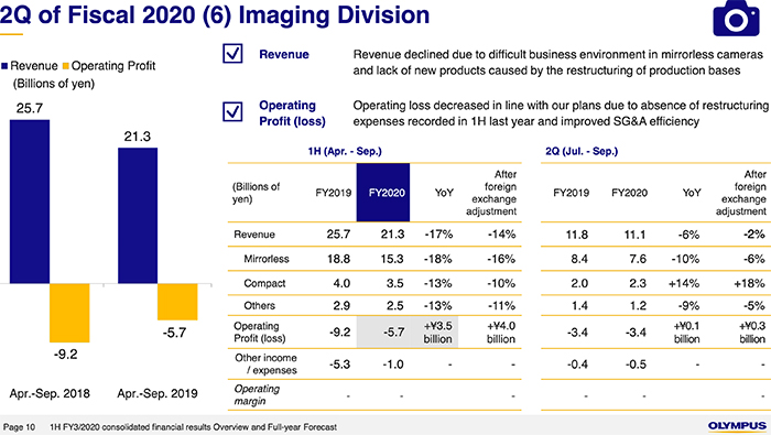 Revenue declined due to difficult business environment in mirrorless cameras and lack of new products caused by the restructuring of production bases