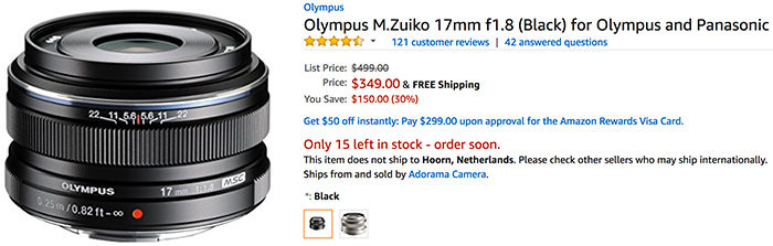 New low price on the Olympus 17mm f/1.8 lens. Now $349!