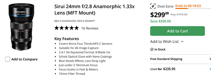 You now get the 24mm anamorphic lens for $299 only at BHphoto (Click here).