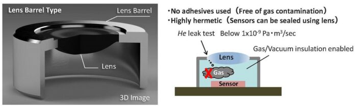 Panasonic has developed a mass production technology of low-cost far-IR aspherical lenses. These lenses are made of chalcogenide glass having excellent transmission characteristics in the far-IR. In addition to realizing low-cost (approx. half compared to the company’s conventional method) by newly developed glass molding method and mold processing technology, Panasonic is now able to offer a variety of lenses such as diffractive lens, the world’s first* highly hermetic frame-integrated lens without using adhesive (leak detection accuracy of less than 1×10-9 Pa・m3/sec in helium leak test).