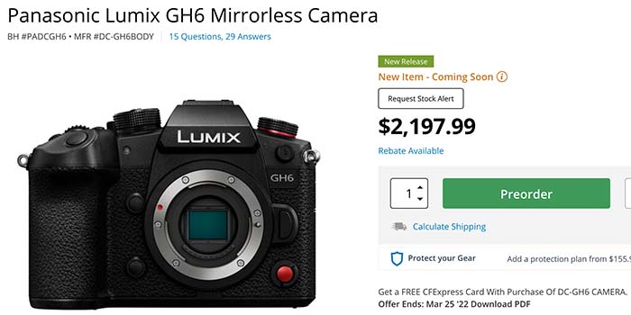 The LUMIX GH6 will be available at valued channel partners for $2,199.99 (body only) and $2,799.99 (body + L-kit package) in mid-March.