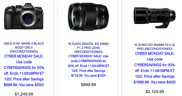 All Olympus Cyber Monday deals can be found on those pages at GetOlympus, Amazon, BHphoto, Adorama, FocusCamera.