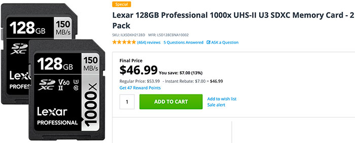 There is a limited time day on Lexar SD cards at Adorama (Click here).