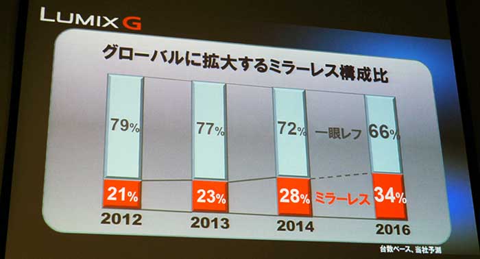 How does Panasonic see the future mirrorless market? At an event in Japan Panasonic projected that slide showing that by end of 2016 mirrorless cameras should increase up to 34% of the overall system camera market (via MirrorlessRumors). DSLR will still keep 66% of the market.