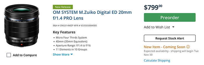 20mm f/1.4 at BHphoto. Adorama. GetOlympus.