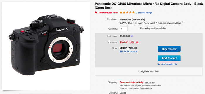 You save $500 on the Open Box Panasonic GH5s sold by Samys on eBay. This is by far the best deal I have ever seen on the GH5s.