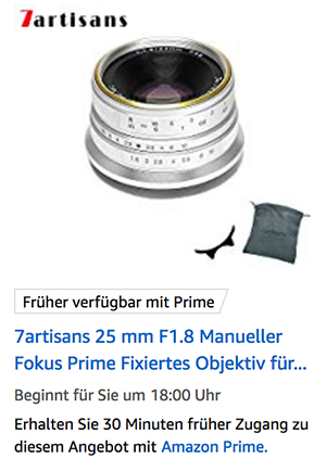 At 18:00 there is a Gold Box deal on the 7Artisans 25mm f/1.8 MFT lens at Amazon Germany.