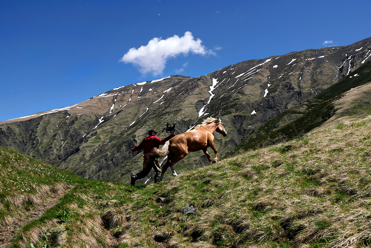 A shepherd looses a packhorse into pasture after arriving at the summer plateau in the Tusheti mountains. GX9 with 12-35mm lens: 1/2000th at F4.5. 200 ISO.