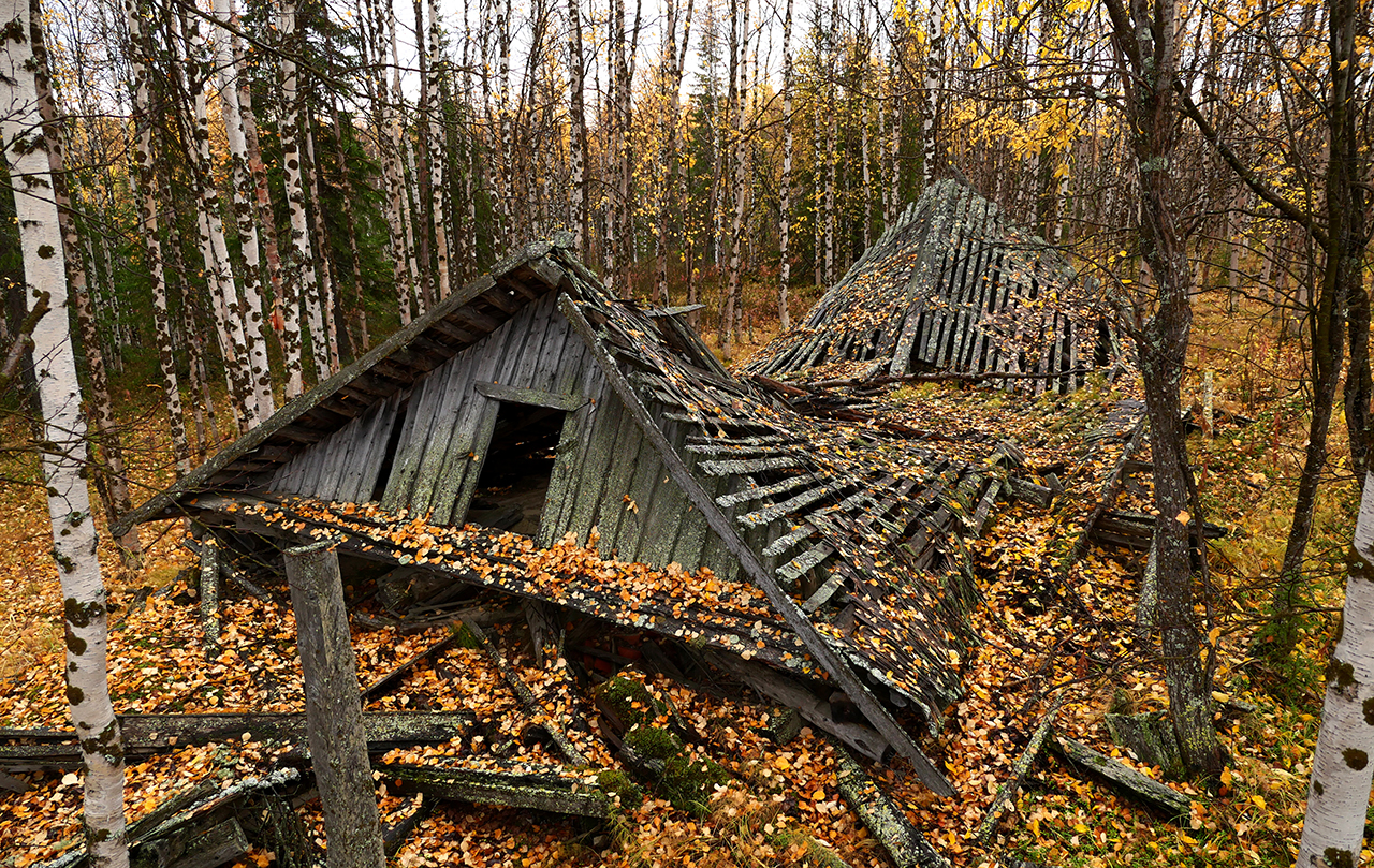 A collapsed barracks inside a former gulag labour camp. GX9 with 12-35mm lens: 1/200th at F3.2. 250 ISO. (Camera attached to a stick for high angle view, photo shot with self-timer.)