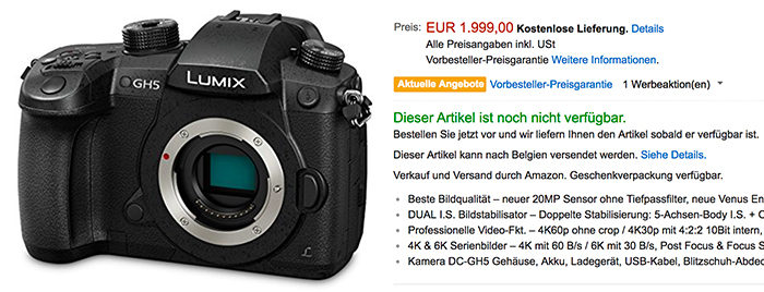European readers can now preorder the GH5 at Amazon Germany (Click here) too. The GH5 battery grip is also available for preorder at Amazon.de, Amazon.co.uk.