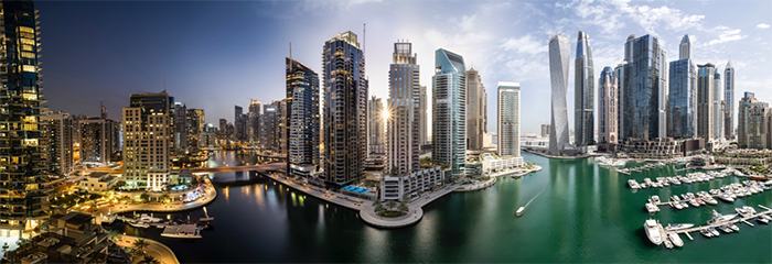 New Districts – Day to night panorama of Dubai Marina with the sun setting in between.