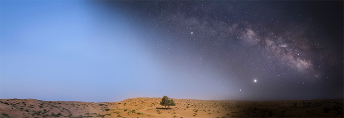 Desert Transitions – The dunes of Ras Al Khaimah on a clear sunny day, and after the Milky Way rose at night.
