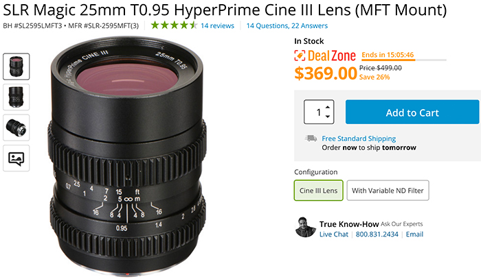 $130 off on the SLR Magic 25mm T0.95 HyperPrime MFT Cine III Lens sold by BHphoto.
