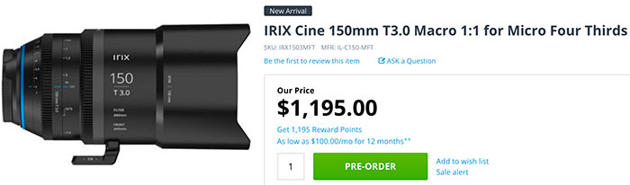 You can now preorder the new IRIX Cine 150mm T3.0 Macro 1:1 for Micro Four Thirds at Adorama.