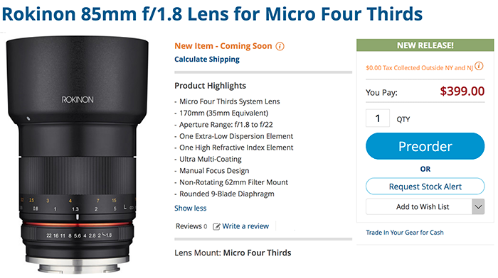You can now preorder the new Rokinon 85mm f/1.8 Lens for Micro Four Thirds